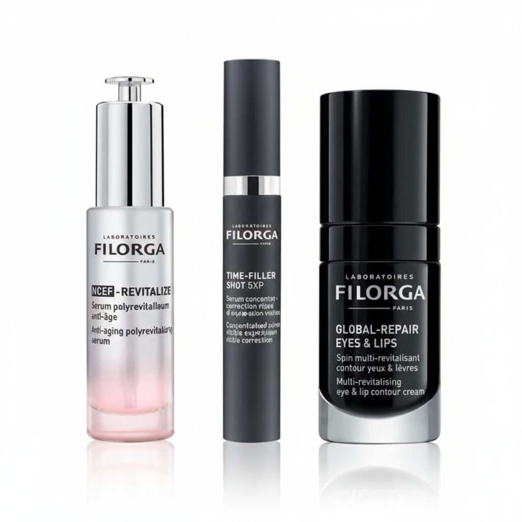 O pack Filorga Ritual Completo Premium é a rotina de excelência para quem procura um protocolo antienvelhecimento multifuncional que atua em várias frentes. O NCEF-Revitaliza Sérum regenera e revitaliza intensamente a pele, o Time-Filler Shot 5XP Sérum corrige todos os tipos de rugas de forma direcionada, e o Global Repair Eyes & Lips trata as zonas mais frágeis do rosto, como o contorno ocular e labial. O resultado é uma pele mais firme, luminosa e rejuvenescida, com um olhar fresco e lábios suavizados.